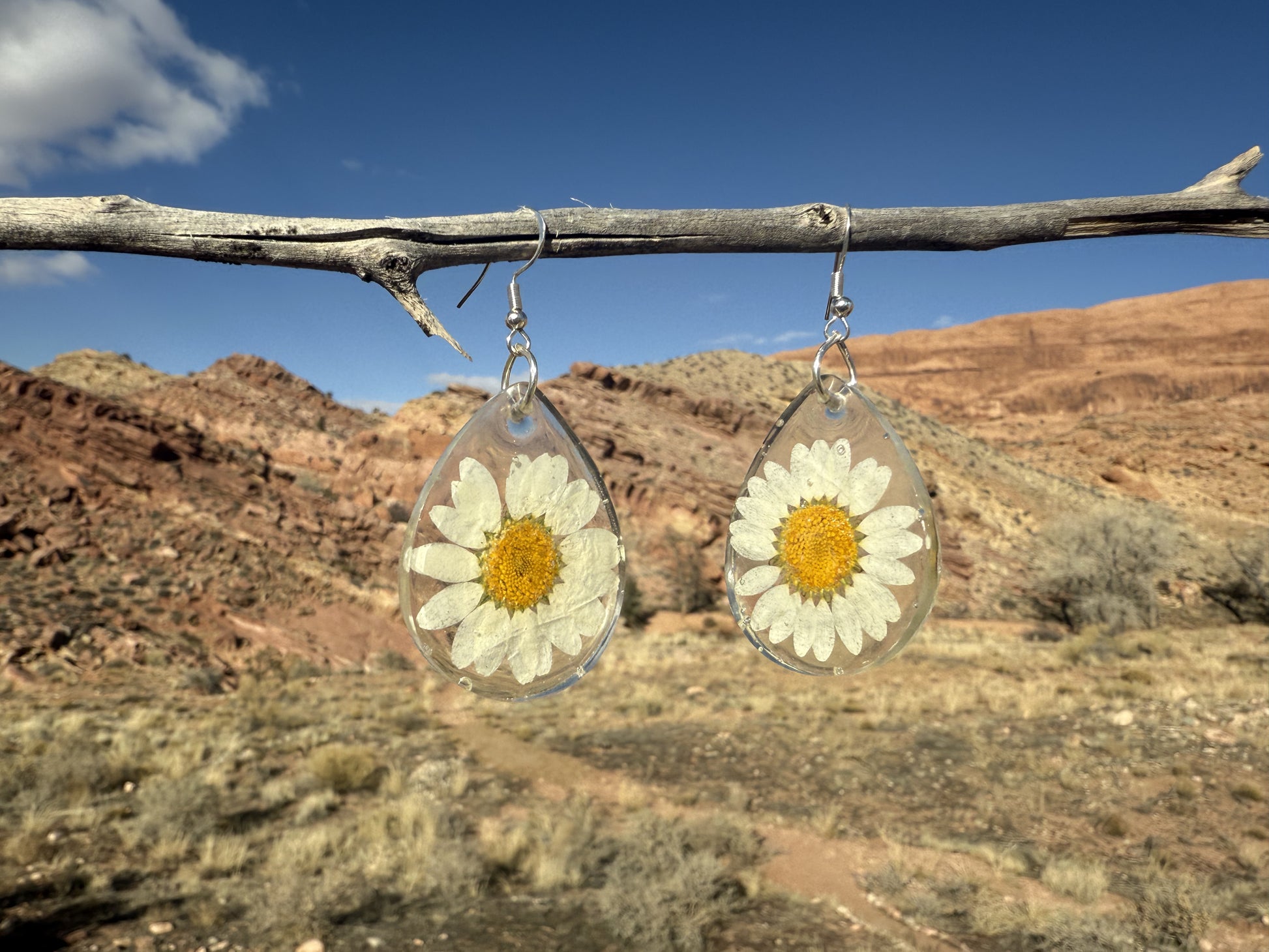 One of a kind small daisy tear drops. Pressed daisies in resin, sterling silver hook and silver plated copper accent loop.