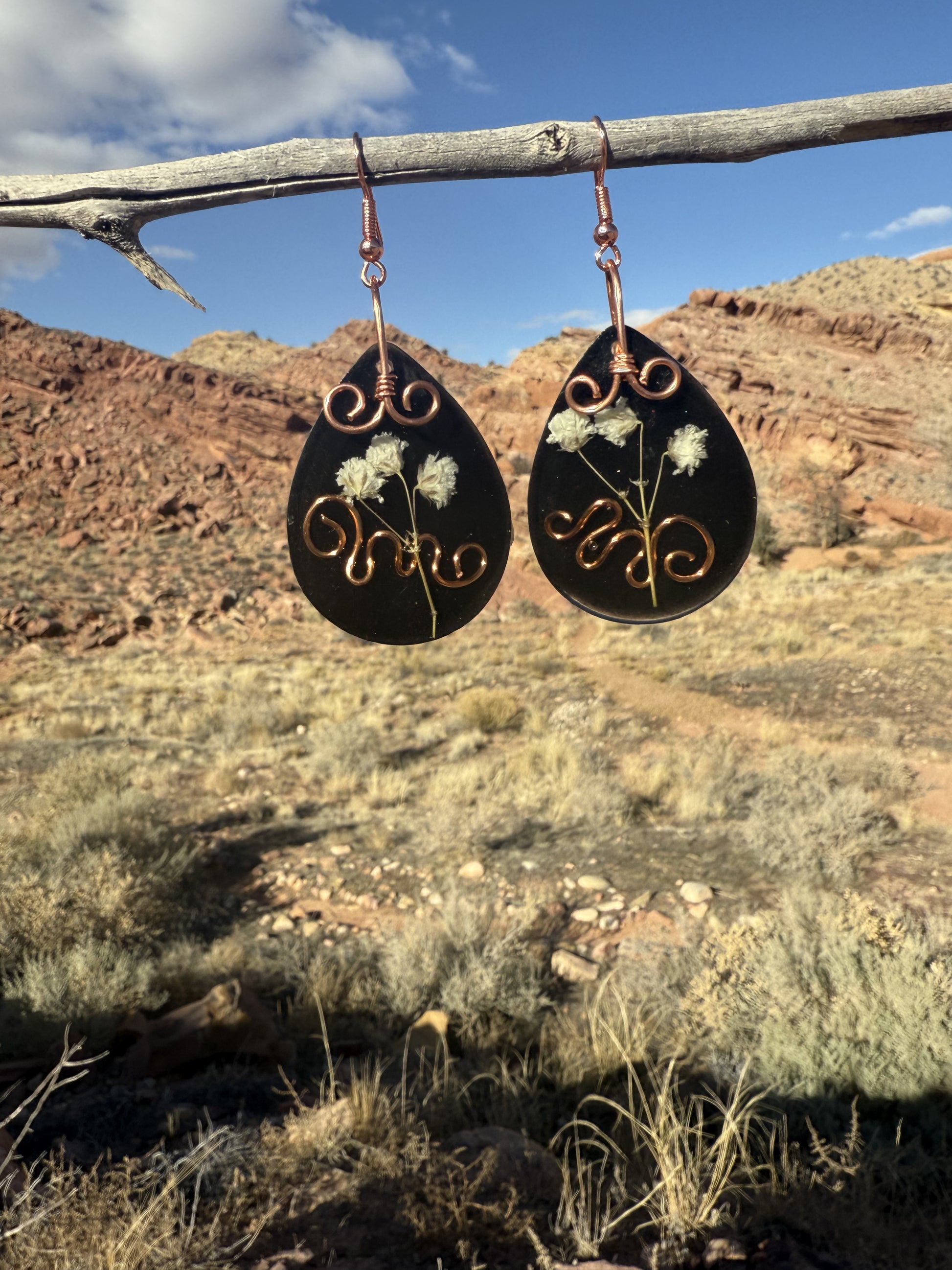 Small teardrops to dangle from your ears, filled with love, black natural, Micah powder, pops of copper, and of course, hand pressed baby breath flowers